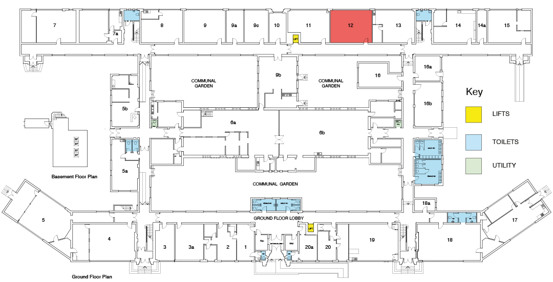 Unit 12 is a bright, open plan Ground Floor work space that faces South. It has a large window running the width of the room and access to a shared small kitchen area just down the corridor.