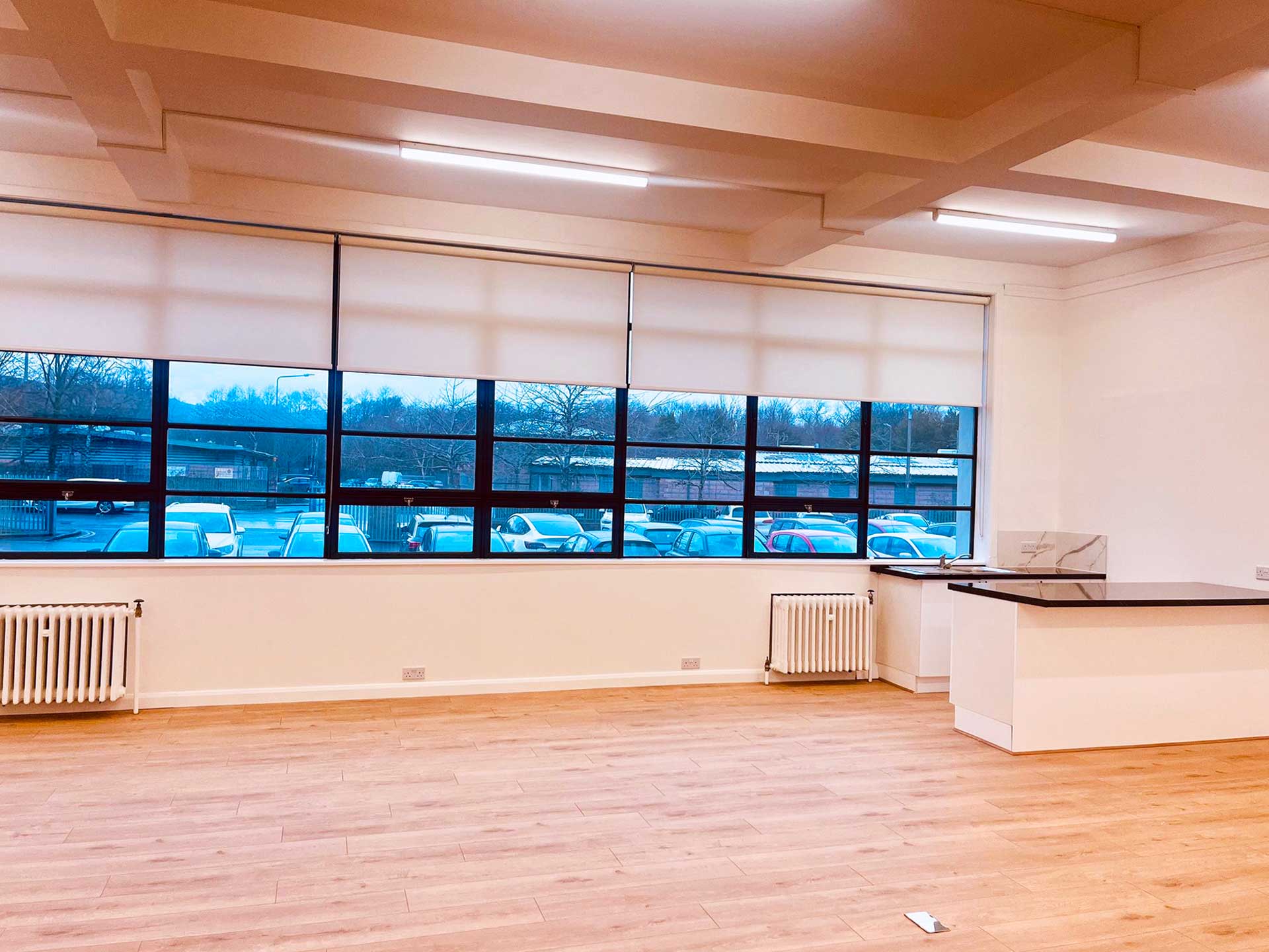 Unit 19 is a bright, open plan Ground Floor work space that looks out to the front of the building. It has a large window that runs the whole length of the unit, and a small kitchen area.